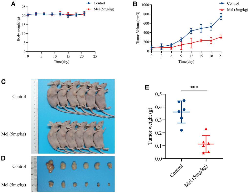 The male BALB/c-nu mice (6 weeks old) were procured from Hunan Slack Scene of Laboratory Animal Co., Ltd (Hunan, China) and raised in a specific pathogen-free (SPF) environment. This study was permitted by the Ethical Committee of Experimental Animals of Zhengzhou University. 5 × 106 GBC-SD cells in PBS (200 μL) were subcutaneously administered into the right-back of every mouse [22]. Then, mice were randomized into two groups (six mice in each group) after which treatment was initiated at a tumor volume of 40 mm3. Saline and 5 mg/kg melatonin were injected intraperitoneally into GBC-SD-bearing mice daily. Mice weights as well as tumor volumes were assessed every 3 days. At a tumor volume of about 900 mm3, mice were sacrificed and tumor tissues weighed.
