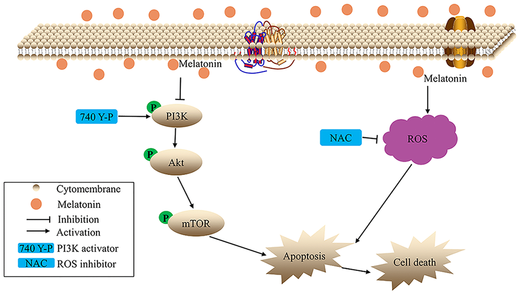 Melatonin (HY-B0075) and 740 Y-P (HY-P0175) were bought from MedChemExpress (MCE, China). A 1mol/L stock solution was attained by dissolving melatonin in dimethyl sulfoxide (DMSO), which was then kept at −20°C in the dark. The DMSO and N-acetyl-L-cysteine (NAC) were provided by the Beyotime (Beyotime Institute of Biotechnology, Shanghai, China). The Cell Counting Kit-8 (CCK-8) was bought from US EVERBRIGHT INC. The primary antibodies used in this study included Bax (ab32503, Abcam, Cambridge, MA, USA), Bcl-2 (ab32124, Abcam, Cambridge, MA, USA), Cytochrome C (ab76237, Abcam, Cambridge, MA, USA), Cleaved Caspase-3 (9662, Cell Signaling Technology Inc, CST, MA, USA), PI3K (AB3263, Technology, Shanghai, China), phospho-PI3K (CY6427), phospho-Akt (AY0421), and Phospho-mTOR (CY5996). The HRP-linked goat anti-mouse and anti-rabbit secondary antibodies were also bought from CST.
