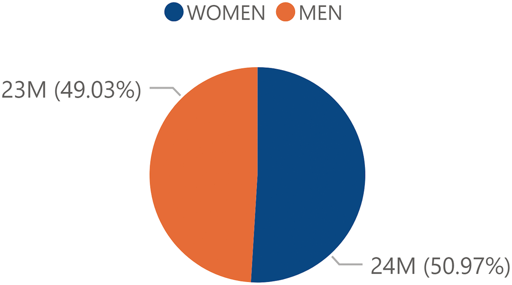 The distribution of the total male and female general population was similar between men and women with a slightly higher proportion of female population (50.97%) compared to male population (49.03%) (Figure 1). However, the total centennial population in Spain referred a clear trend in terms of its distribution towards the female sex with a percentage of 76.73% and with a male percentage of 23.27% (Figure 2).