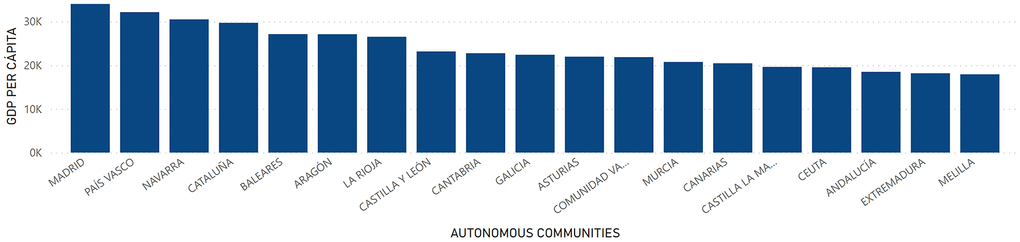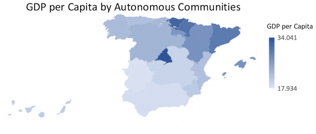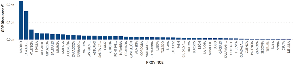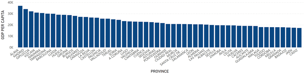 At the provincial level, GDP had a higher value in the territories of Madrid with a total of 221,432,620 thousand euros, Barcelona with 163,829,876 thousand euros and Valencia with 57,719,399 thousand euros. On the other hand, the provinces of Melilla with a GDP of 1,520,977 thousand euros; Ceuta with 1,660,550 thousand euros; and Soria with 2,192,878 thousand euros were those with the lowest levels of GDP in Spain (Figure 7). Regarding GDP per Capita, Álava, Madrid and Vizcaya presented the highest figure with a value of 36,921; 34,041 and 32,015 euros, respectively. On the other hand, Cádiz, Jaén and Badajoz presented the lowest figures with 17,231; 17,465 and 17,637 euros, respectively (Figure 8).