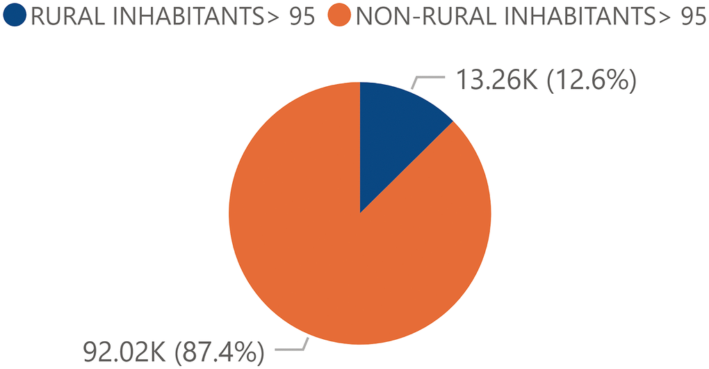The total Spanish population had a significant tendency of distribution towards the urban or non-rural areas. Thus, a relativized total non-rural population of 94.14% and a rural population of 5.86% was observed (Figure 3). The centennial population followed a similar pattern to that of the total population: there was a higher proportion of individuals in urban areas (87.4%) than in rural areas (12.60%) (Figure 4).