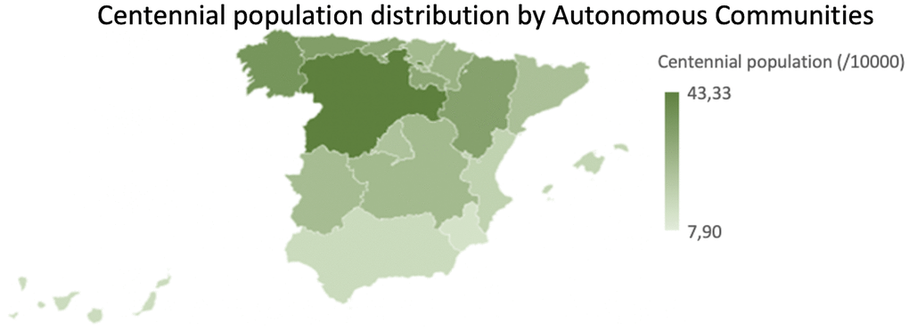 Although there are many studies worldwide [3–7, 21], information about centennial population is scarce in Spain [22–24]. From the few studies that have been previously performed in the centenary population in Spain, we found the following evidences: i) there was feminization of aging in Spain [22–24]; ii) the Autonomous Communities with more centennial people were Asturias, Castilla y León, Galicia, País Vasco, Aragón and Cantabria, while the communities with less centennial people were Canarias, Murcia and Islas Baleares [24]; iii) the areas with the highest density of centenarians in Spain corresponded to regions with a large number of rural areas where the society had dedicated their time for daily work outdoors, such as cattle raising and agriculture; iv) the oldest Spanish rural areas correspond to the Autonomous Communities and provinces of Castilla y León, Asturias, Cantabria, Aragón, Guadalajara and Cuenca [23] and v) the centennial Spanish people stated to have good perceived health, be independent with Activities of Daily Living (ADL) and to own good lifestyle activities such as Mediterranean diet and regular exercise [22].