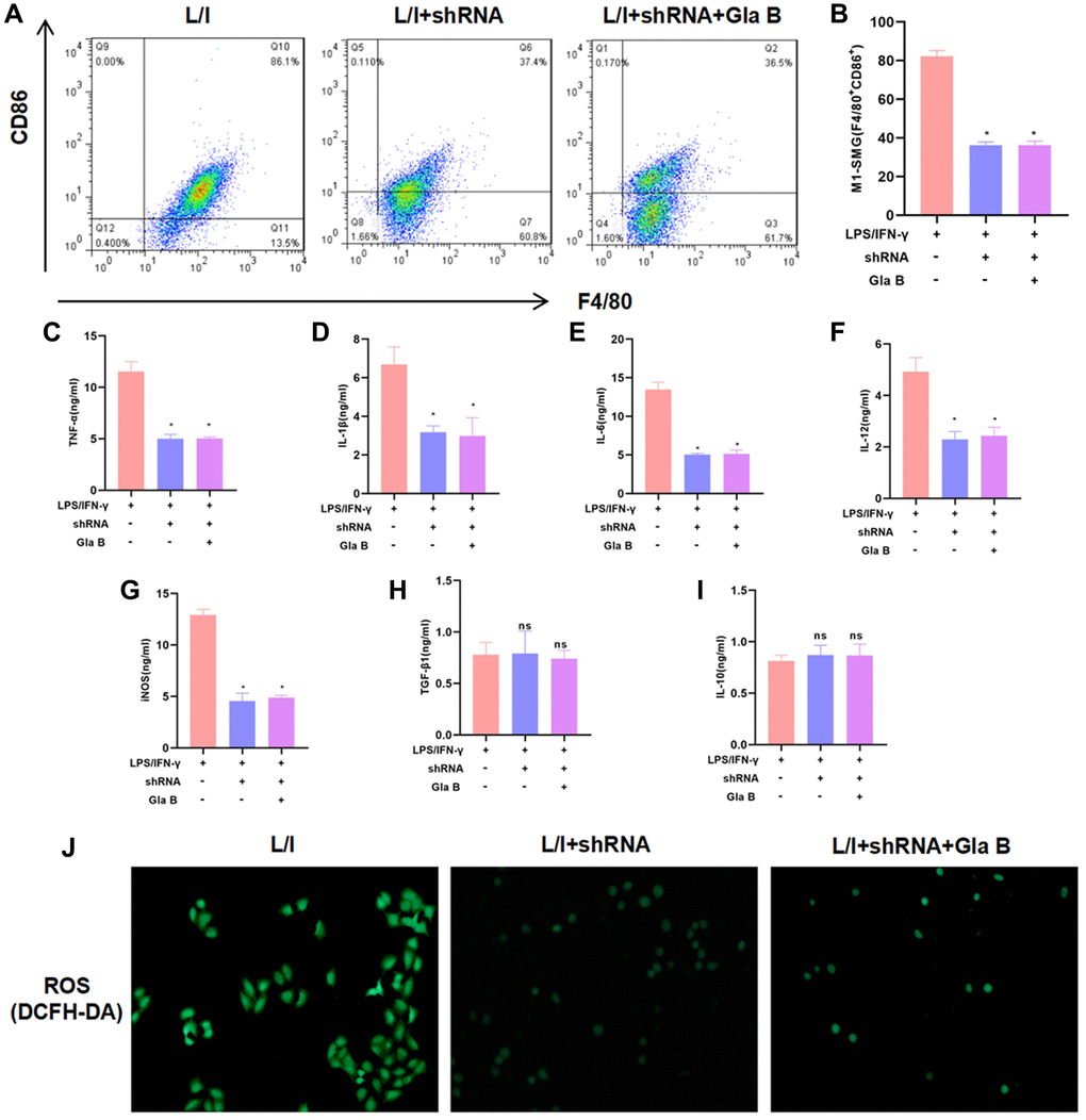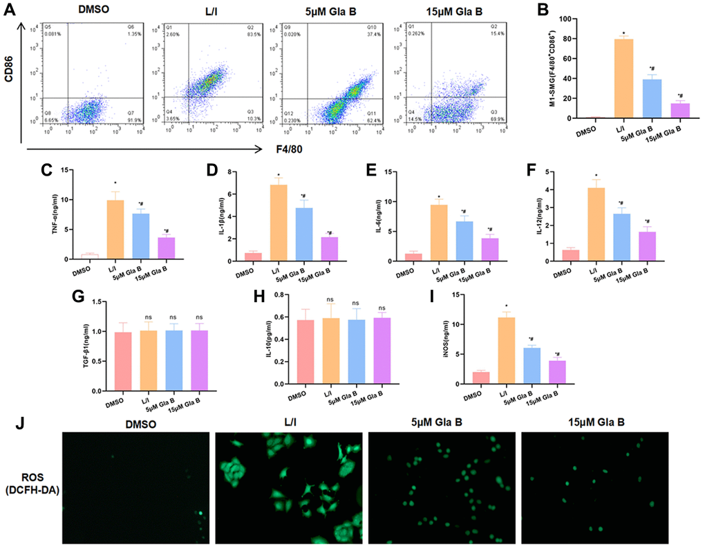 In our study, F4/80 and CD86 were used to label M1 macrophages. LPS and IFN-γ can induce SMG M1 polarization, with the cell proportion over 80%. Gla B treatment could inhibit M1 polarization and the ratio of F4/80 + CD86 + M1 cells was significantly down-regulated, which was lower than L/I (Figure 1A–1B). The detection of M1 cell marker protein found that the levels of TNF-α, IL-1β, IL-6, iNOS and IL-12 were significantly up-regulated after SMG M1 polarization; and Gla B could inhibit the level of cytokines, which was lower than L/I group (Figure 1C–1F, 1I). The expression of M2 cell marker protein (including TGF-β1 and IL-10) was significantly changed, which was independent of Gla B (Figure 1G–1H). As a marker of M1 cell, ROS was up-regulated in L/I (1.98 ± 0.12), which was significantly higher than DMSO (0.07 ± 0.01); and Gla B could inhibit the level of ROS (1.10 ± 0.55) and (0.44 ± 0.07) (Figure 1J).