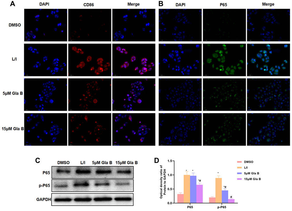 IF staining showed that the levels of CD86 and P65 were significantly up-regulated in M1 SMG, which were higher than those in DMSO group. Gla B could inhibit the expression of P65 and CD86, with lower fluorescence intensity than that of L/I group (Figure 2A–2B). Protein detection also revealed that the levels of P65 and p-P65 were up-regulated in M1 SMG, and Gla B could inhibit the expression of P65 and p-P65 (Figure 2C–2D).