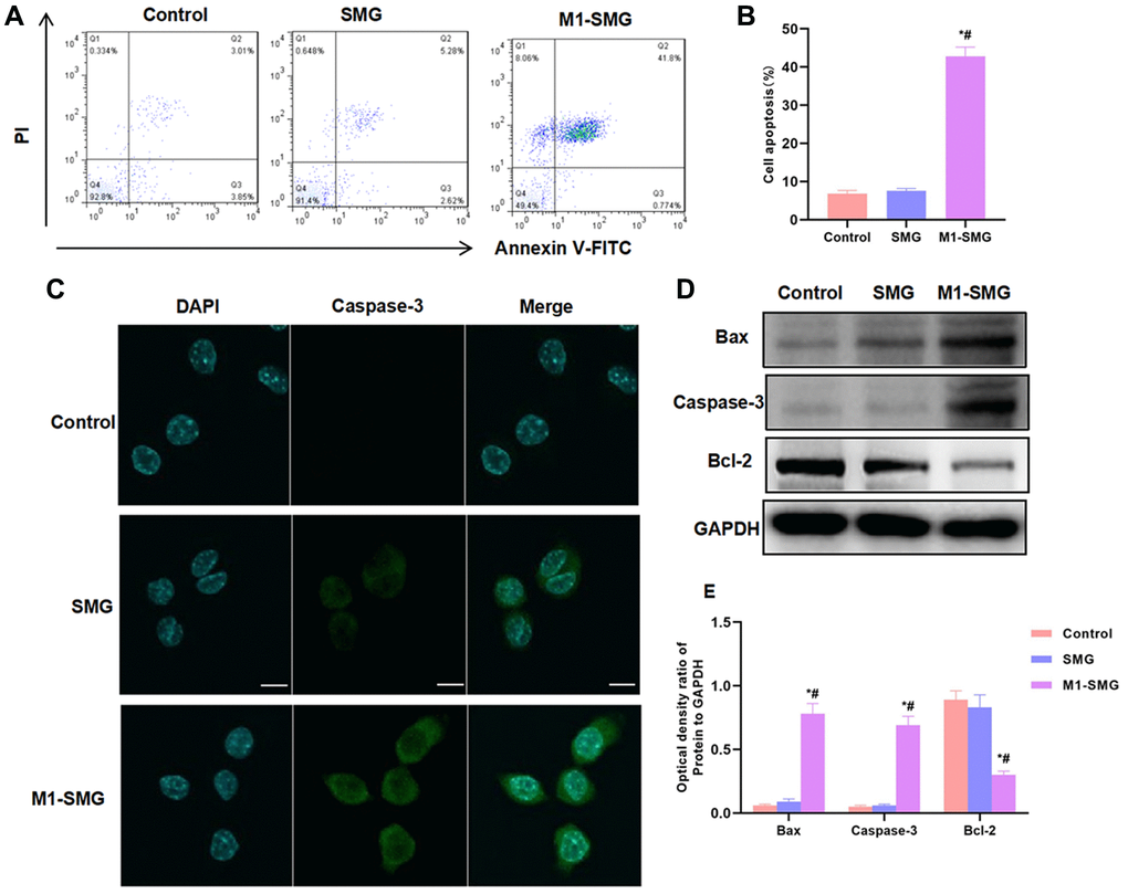 To investigate the possible injury of M1 SMG on cartilage cells, SMG or M1-SMG was co-cultured with cartilage cells. As a result, SMG had no obvious injury on cartilage cells, with a low apoptotic level; M1-SMG could promote cartilage cell injury and increase apoptotic level (Figure 4A–4B). Caspase-3 fluorescent staining showed that Caspase-3 was barely expressed in Control and SMG, while M1-SMG could enhance the expression of Caspase-3 and promote (Figure 4C). Detection of apoptotic proteins also found that M1-SMG promoted the expression of Bax and Caspase-3, with significantly higher relative protein expression level than that of Control and SMG (Figure 4D–4E).