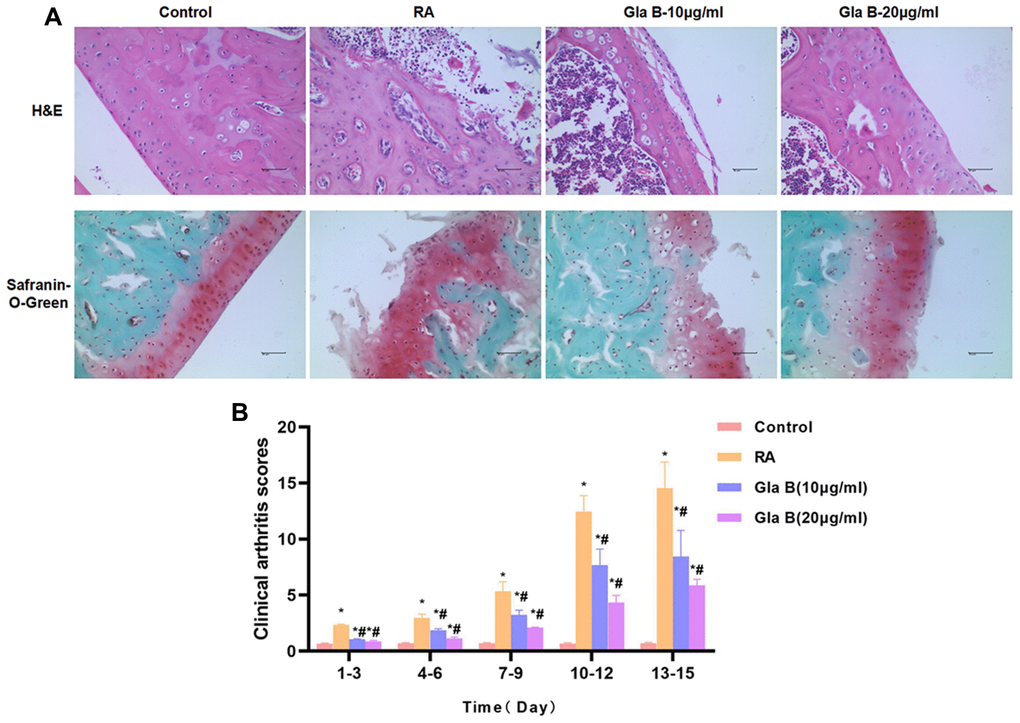 Collagen antibodies and LPS were combined to construct RA mouse model. The clinicopathological score of RA mice was significantly increased over time, which was significantly different from Control. H and E staining and safranin-O-Green staining showed obvious injury in cartilage, obvious inflammatory response in the cartilage tissue and significant apoptosis, showing abnormal characteristics of cartilage tissue. While the tissue structure was intact in Control group, without no obvious inflammation or injury, which were significantly different from RA mice. Gla B intervention could decrease the pathological score of mice. And the score of the same time period was significantly lower than that of RA (Figure 5B). Gla B could also attenuate cartilage injury in RA mice. The staining results showed that Gla B inhibited cartilage inflammation and bone destruction, which was significantly different from RA in pathology (Figure 5A).