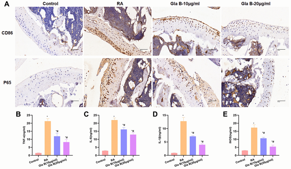 The staining of CD86 and P65 showed no obvious CD86 expression, relatively low infiltration level of M1 cells and relatively low level of P65 in Control group. The expression of CD86 and P65 was significantly up-regulated in RA, which was significantly different from Control group; with obvious infiltration of M1 cells. Gla B could inhibit the levels of CD86 and P65, which was significantly different from RA (Figure 6A). The detection of M1 cell marker protein showed that the levels of TNF-α, IL-1β, IL-6 and iNOS were significantly up-regulated in RA, which were higher than those of Control. Gla B inhibited the expression of TNF-α, IL-1β, IL-6 and iNOS, which was significantly lower than that of RA group (Figure 6B–6E).