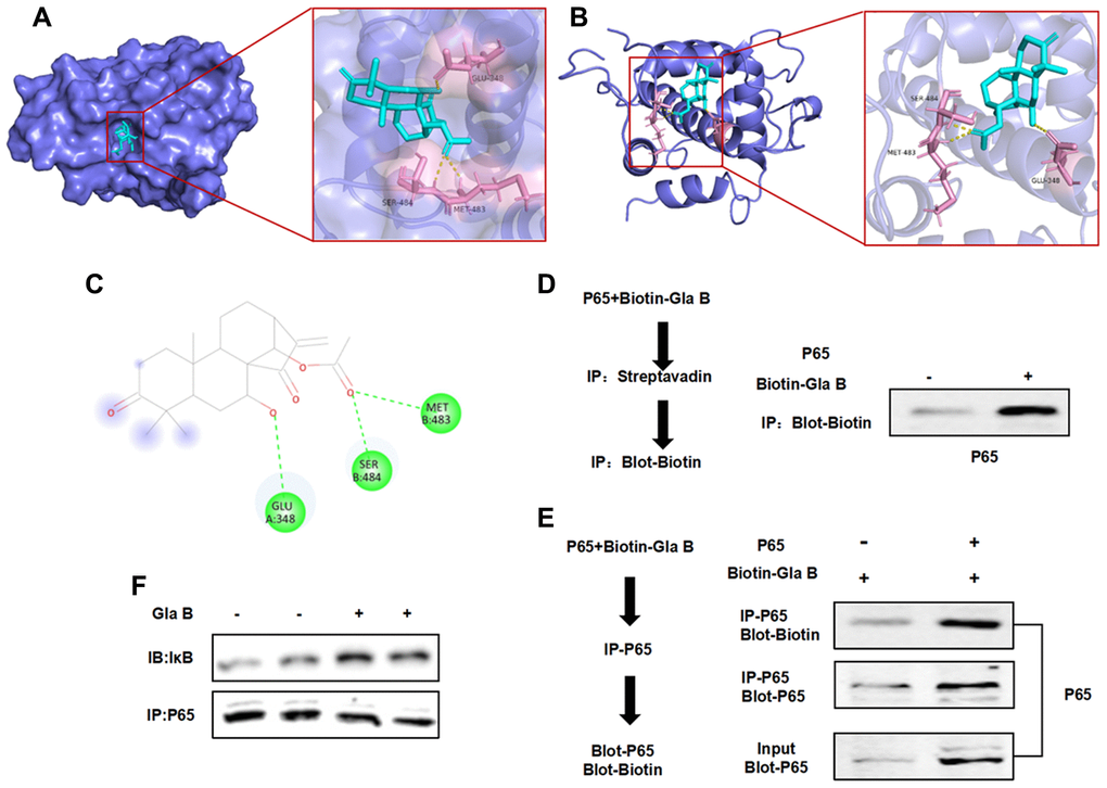 Pull-down assay also showed that recombinant P65 protein could bind to Gla B, Biotin-labeled Gla B could bind to P65, with positive expression of Biotin. Taken together, the results of molecular docking and pull-down assay showed that Gla B had a binding relationship with P65 (Figure 7).