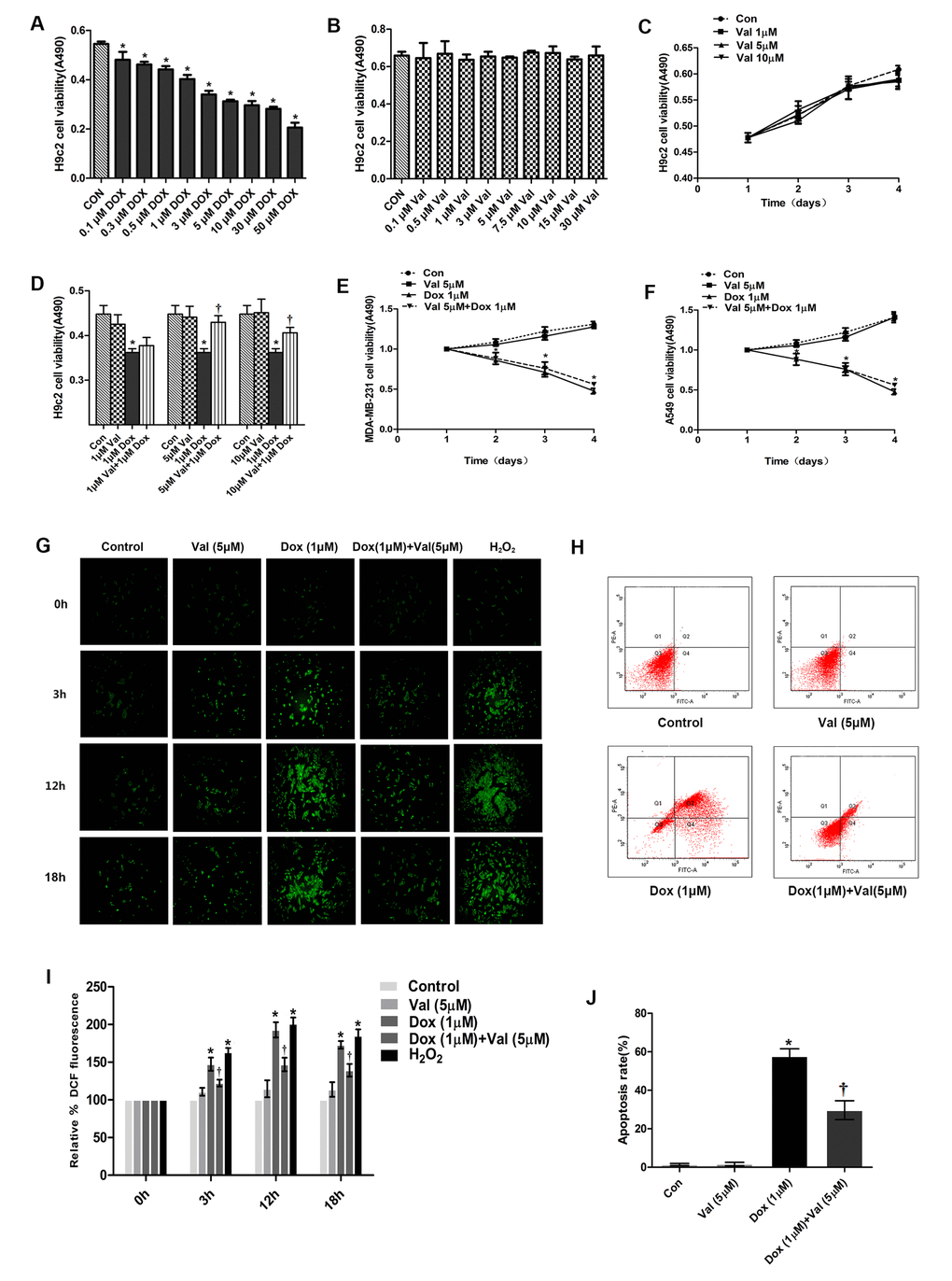 MTT assay was used to determine the cell viability. 3×104 cells/well H9c2 cells were seeded on 96 well plates and 4.5×103 cells/well MDA-MB-231 cells and A549 cells were seeded on 96 well plates overnight at 5% CO2, 37° C incubator. Val was dissolved in anhydrous ethanol (the final working concentration of anhydrous ethanol should not exceed 0.01%) and DOX was dissolved in deionized water. H9c2 cells, MDA-MB-231 cells or A549 cells pre-treated with Val (5 μM) for 1 h followed by DOX (1 μM) for 24 h. Subsequently, 20 μL MTT (5 mg/mL) was added to each well, 4 hours later, cell viability was detected through measuring the absorbance at 490 nm by a microplate reader.