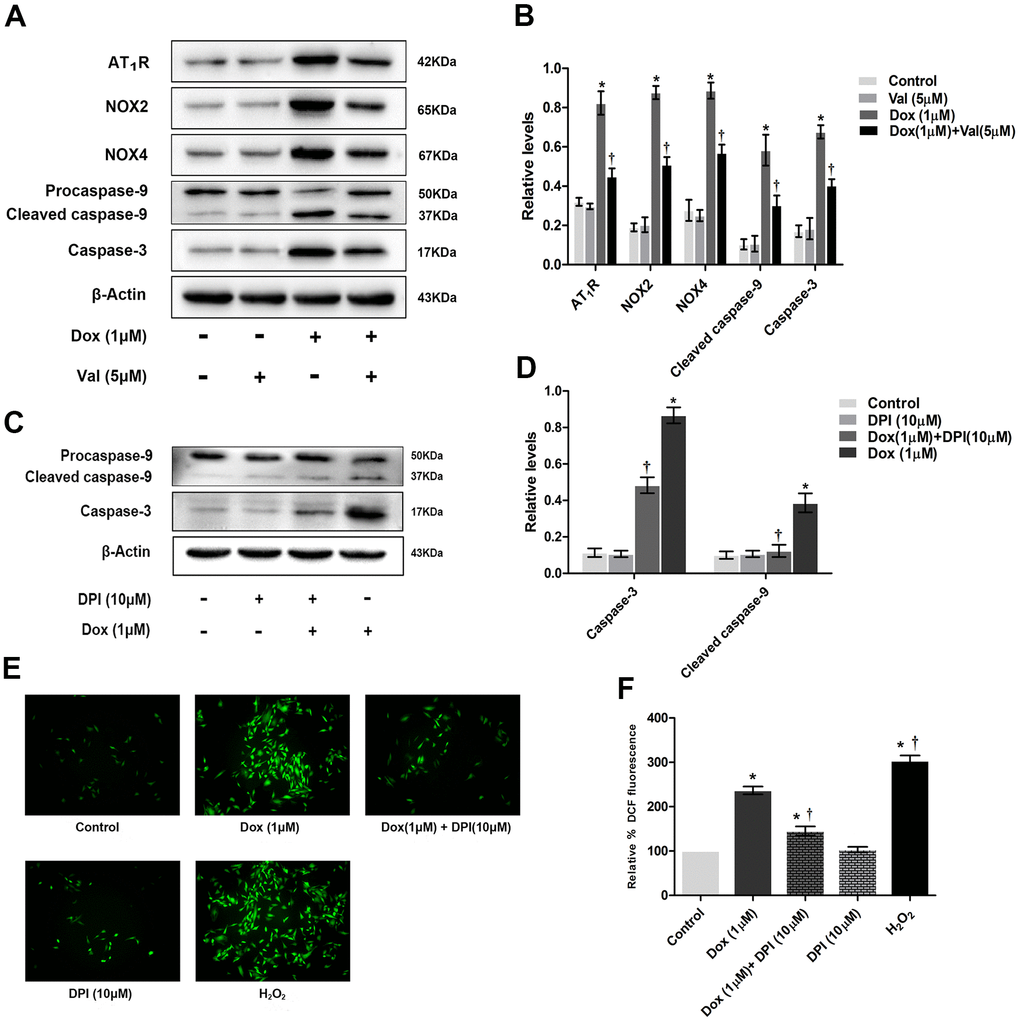 The expression of AT1R, NOX2 and NOX4 in the DOX group was significantly higher than that in the control group. The expression of AT1R, NOX2 and NOX4 was significantly lower in DOX+Val group than that in DOX group (Figure 2A, 2B). The expression of caspase-3 and cleaved caspase-9 in DOX group was significantly higher than that in the control group. The expression of caspase-3 and cleaved caspase-9 was significantly lower in DOX+Val group than that in DOX group (Figure 2A, 2B). Taken together, Val can downregulate the expression of AT1R, NOX2, NOX4, caspase-3, cleaved caspase-9 and the content of ROS in H9c2 cells stimulated by DOX. DPI is an inhibitor of NADPH oxidase, which inhibits both NADPH subunits NOX2 and NOX4 [20]. The expression of caspase-3 and cleaved caspase-9 in DOX+DPI group was significantly lower than that in DOX group (Figure 2C, 2D). The expression of ROS in DOX+DPI group was significantly lower than that in DOX group (Figure 2E, 2F). These results indicate that DPI can reduce the expression of caspase-3, cleaved caspase-9 and the content of ROS in H9c2 cells stimulated by DOX. This result indicates that NADPH activation plays a crucial role in DOX-induced cytological toxicity.