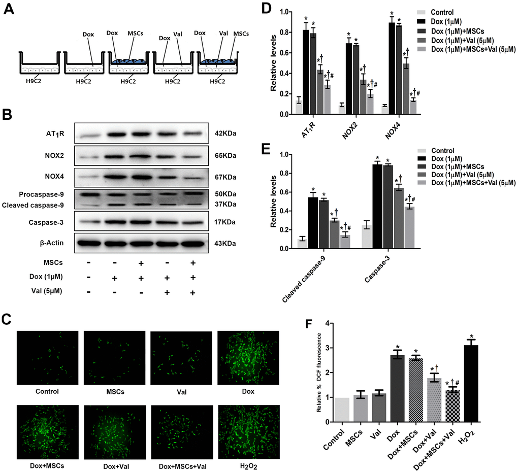 To verify if there is a synergic protective effect of MSC with Val, we co-cultured cells with both MSC and Val and used the Transwell system to prevent direct exposure of MSCs to H9c2 cells (Figure 5A). The expressions of AT1R, NOX2, NOX4, caspase-3 and cleaved caspase-9 were significantly higher in DOX group than in control group. The expressions of AT1R, NOX2, NOX4, caspase-3 and cleaved caspase-9 were similar between DOX+MSCs group and DOX group. However, the expressions of AT1R, NOX2, NOX4, caspase-3 and cleaved caspase-9 were significantly lower in DOX+MSCs+Val group than in DOX+MSCs and DOX+Val groups (Figure 5B, 5D, 5E). The generation of ROS was significantly higher in DOX group than in control group. The generation of ROS was similar between DOX+MSCs group and DOX group. But the generation of ROS was significantly lower in DOX+MSCs+Val group than in DOX+MSCs and DOX+Val groups (Figure 5C, 5F). From the result, it was apparent that MSCs therapy alone could not effectively reduce the expressions of AT1R, NOX2, NOX4, caspase-3 and cleaved caspase-9 proteins and the generation of ROS in H9c2 cells treated with DOX. Taken together, MSCs enhanced the protective effects of Val on alleviating the DOX-induced cytotoxicity in H9c2 cells.