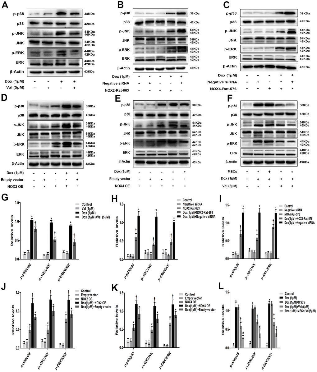 p-p38, p-JNK, p-ERK protein expressions in DOX-treated H9c2 cells was evaluated in the presence of Val, MSCs, NOX siRNA or plasmid. The expressions of p-p38, p-JNK, p-ERK were significantly higher in DOX group than in control group. The expressions of p-p38, p-JNK, p-ERK were significantly lower in DOX+Val group than that in DOX group (Figure 6A, 6G). The expressions of p-p38, p-JNK, p-ERK were significantly higher in DOX+Negative siRNA group than in Negative siRNA group. The expressions of p-p38, p-JNK, p-ERK were significantly lower in DOX+NOX2 siRNA and DOX+NOX4 siRNA groups than in DOX+Negative siRNA group (Figure 6B, 6C, 6H, 6I). The expressions of p-p38, p-JNK, p-ERK were significantly higher in DOX+Empty vector group or NOX2 OE group or NOX4 OE group than in Empty vector group. The expressions of p-p38, p-JNK, p-ERK were significantly higher in DOX+NOX2 OE and DOX+NOX4 OE groups than in DOX+Empty vector group (Figure 6D, 6E, 6J, 6K). The expressions of p-p38, p-JNK, p-ERK were similar between DOX+MSCs group and DOX group. However, the expressions of p-p38, p-JNK, p-ERK were significantly lower in DOX+MSCs+Val group than in DOX+MSCs and DOX+Val groups (Figure 6F, 6L). From the result, it was apparent that DOX could activate the MAPK signaling pathway, which was characterized by increased protein expressions of p-p38, p-JNK, p-ERK. NOX2 and NOX4 were involved in the activation of MAPK signaling pathway induced by DOX. Val could reduce the expression of p-p38, p-JNK, p-ERK proteins, and MSCs alone could not reduce these proteins. However, MSCs enhanced the protective effects of Val in DOX-treated H9c2 cells.