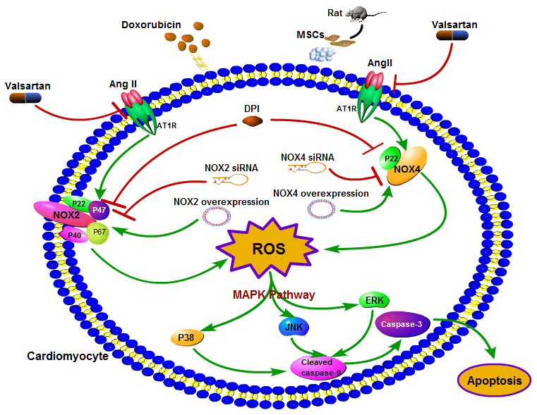 Previous study found that angiotensin II (AngII) blocker was effective in attenuating DOX-induced cardiotoxicity [11] and our previous study also showed that repeated intravenous injection of mesenchymal stem cells (MSCs) could significantly ameliorate DOX-induced myocardial damage in rats [12]. It is known that the DOX-induced excessive ROS generation is a major mechanism of DOX-induced myocardial damage [5], which could also cause activation of the renin-angiotensin-aldosterone system (RASS) [13], activation of the MAPK pathway, leading to apoptosis of cardiomyocytes [14, 15]. Besides, NADPH oxidase (NOX) signaling is also activated in DOX-induced cardiac insult model [16]. Thus, NOX/ROS/MAPK signaling pathway plays a central role in the pathogenesis of DOX-induced cardiotoxicity. In the present study, we explored the impact of DOX on NOX/ROS/MAPK signaling pathway in vitro using H9c2 cells and observed the impact of AngII receptor blocker valsartan (Val) in the presence or absence of MSCs on attenuating DOX-induced toxicity in H9c2 cells and related mechanisms via NOX/ROS/MAPK signaling pathway.