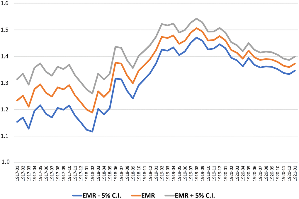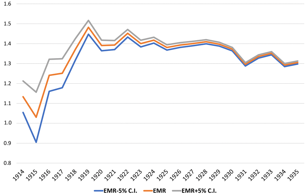 Two main events, during the second half of 1918, may be associated to the EMR difference during the 2020 pandemic as reported in this article: the end of WWI on November 11, 1918 and the outbreak of the Spanish flu due to H1N1 influenza virus, which was attested in Belgium since July 1918.