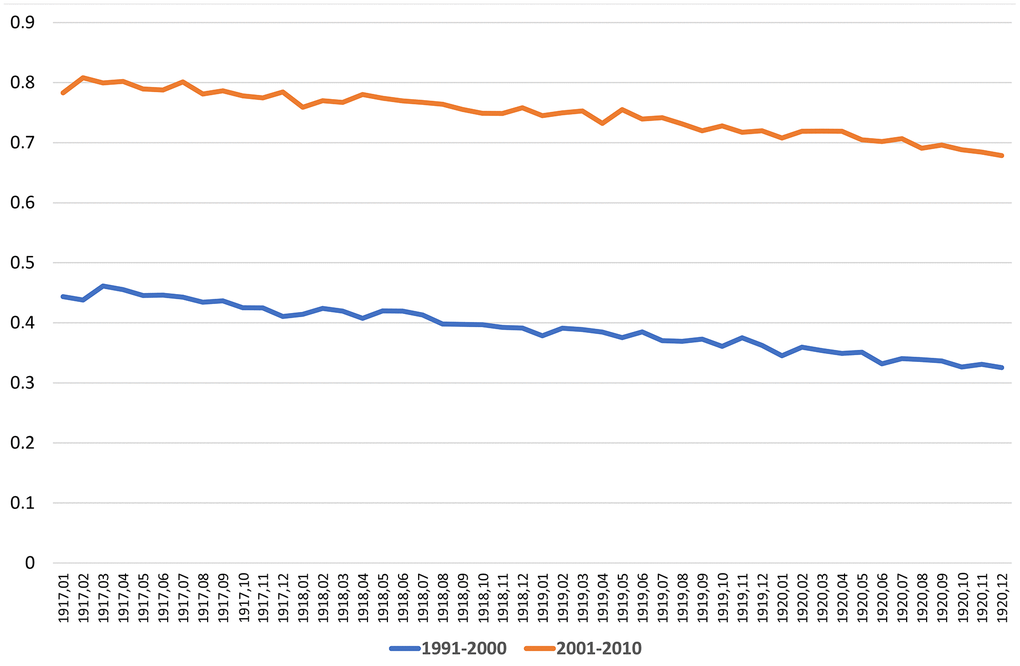 WWI (1914-1918) led to a period of deprivation for the Belgian population suffering under German occupation. Especially in 1917 and 1918, the nutritional status and sanitary conditions of the population had further worsened until 1920 [10]. The impact of nutrient deficit and low-quality foods during wartime may have had devastating effects on both the short- and long-term health of the new-born. Protein-energy malnutrition may heavily affect the course of pregnancies, causing increased stillbirth rates [11]. Unfortunately, no data on the number of stillborn and only little data on the level of infant mortality during WWI are available in Belgium [12]. An increase in infant mortality was observed in 1917 and 1918, a similar trend also reported in the neighboring countries, e.g., France and the Netherlands [13]. Such an increase may have resulted in a stronger selection against the weakest babies, born in this period, considering that harsh privations persisted more than a year after the end of the war. Research on French children born during WWI revealed that, in general, parental socioeconomic conditions were a strong predictor of new-borns’ longevity [14]. Children whose mothers had faced famine during pregnancy tended to have a shorter lifespan [15]. These long-term effects have been ascribed to a direct fetal distress or mediated by epigenetic mechanisms [16]. Nevertheless, it is important to mention the strong support by the U.S. Commission for Relief in Belgium that improved the food supply for babies, thereby ensuring them better early-life conditions despite the poor socio-economic context lasting until the end of 1919 [17]. Although some kind of selection early in the life of these generations can hardly be excluded, its impact on their survival into old ages is unknown, and there is no consensus on the existence of its favorable or detrimental significance [18]. If such a selection was real and supposed to be favorable for survival, babies born during WWI or immediately after would be expected to have different mortality risks along their whole lifespan and not exclusively at the extreme end of life. To test the selection hypothesis, we disaggregated the mortality risks of babies born before and after the end of WWI, considering their month and year of births for the periods 1991-2000 and 2001-2010. The corresponding curves presented in Figure 4 do not show any evidence of a significant variation of mortality for people born around the end of WWI. We cogently conclude that a selection in terms of WWI can hardly be responsible for the relative better survival of ‘older’ centenarians compared with ‘younger’ ones against 2020 COVID-19, despite both groups likely experiencing similarly threatening early-life conditions during the three years around the end of WWI.