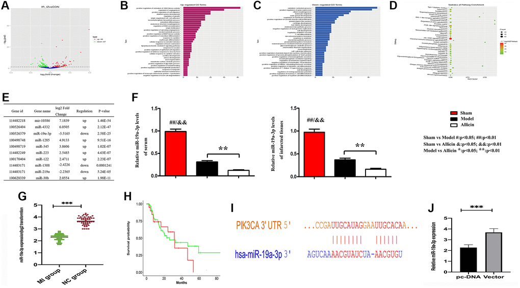 The miRNA microarray was carried out to examine the expressed miRNAs in MI/R tissues and corresponding normal tissues. We identified differently expressed miRNAs by the criteria of |fold change| >2 and P < 0.05 between MI/R and normal controls, a well-defined distinction on the significantly different expression of miRNAs was depicted in the volcano map. 67 genes were significantly downregulated, and 68 genes were upregulated (Figure 4A). Functional classification of these differentially expressed genes based on the Gene Ontology (GO) annotations was performed and found 35 up-regulated pathways (Figure 4B), including regulation of angiogenesis and regulation of growth. Furthermore, we also found 43 down-regulated pathways (Figure 4C). Similarly, partial results of the KEGG pathways were shown in Figure 4D. Several previous studies highlight that the PI3K/ARK pathway plays a crucial role in the activation of the mTOR signaling pathway, promoting angiogenesis regulation [21]. We have found that Allicin protects against myocardial IR by accelerating angiogenesis via the PI3K/AKT axis. Therefore, we wanted to further explore the molecular mechanism of the protective role of Allicin and select miRNAs with statistical difference and related to angiogenesis for further study.