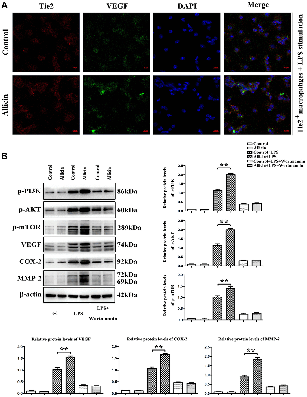 Evidence has indicated that LPS is a well-known M1 inducer that could produce proinflammatory cytokines in macrophages [25]. Tie2 expressing macrophages /monocytes (TEMs) play essential roles in the neovascularization of ischemic tissues [16]. In vitro study, LPS stimulated Tie2 expressing macrophages were cultured in an ischemic buffer. We found that the protein expression levels of p-PI3K, p-AKT, p-mTOR, VEGF, COX2, and MMP2 in LPS stimulated TEMs were gradually increased by Allicin treatment in comparison with the vehicle group. Furthermore, the accumulation of VEGF was noticeably visualized with fura-2/AM fluorescence in the Allicin treated TEMs. Next, we determined if PI3K pathway activation regulates VEGF and MMPs expression in TEMs. The pretreatment with Wortmannin, a specific PI3K inhibitor, reversed the increased p-PI3K, p-AKT, p-mTOR, VEGF, COX2, and MMP2 in TEMs.