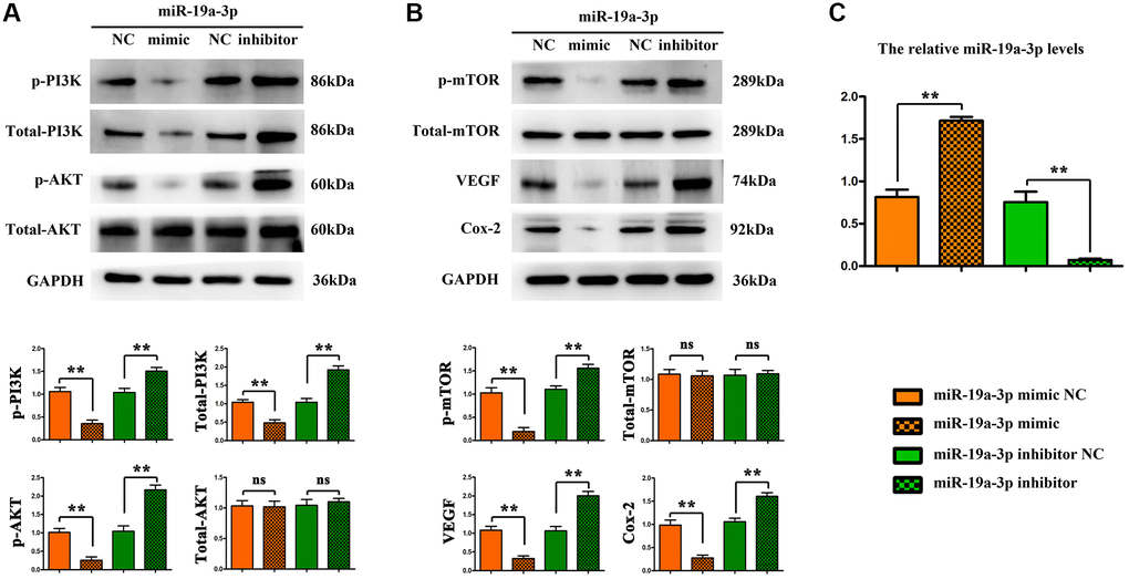Furthermore, we verify the regulation of miR-19a-3p on PI3K pathway by using neonatal mice tie2+ macrophages using the flow cytometry sorting method. MiR-19α-3p mimic/inhibitor were transfected to promote/inhibit the expression of miR-19a-3p, miRNA control and inhibitor control transfection being taken as control. And then, mice tie2+ macrophages were oxygenated for 4 hours and then reoxygenated for 2 hours to simulate the ischemia-reperfusion model in vitro. Compared with the control group, the expression of p-PI3K, p-AKT, p-mTOR, VEGF, Cox-2, MMP-2 were significantly decreased after miR-19α-3p mimic transfection, and further significantly increased after miR-19α-3p inhibitor transfection (Figure 6A and 6B). The miR-19α-3p levels of each groups were shown in Figure 6C. These data suggest that inhibition of miR-19a-3p promotes angiogenesis by regulating PI3K/AKT pathway.