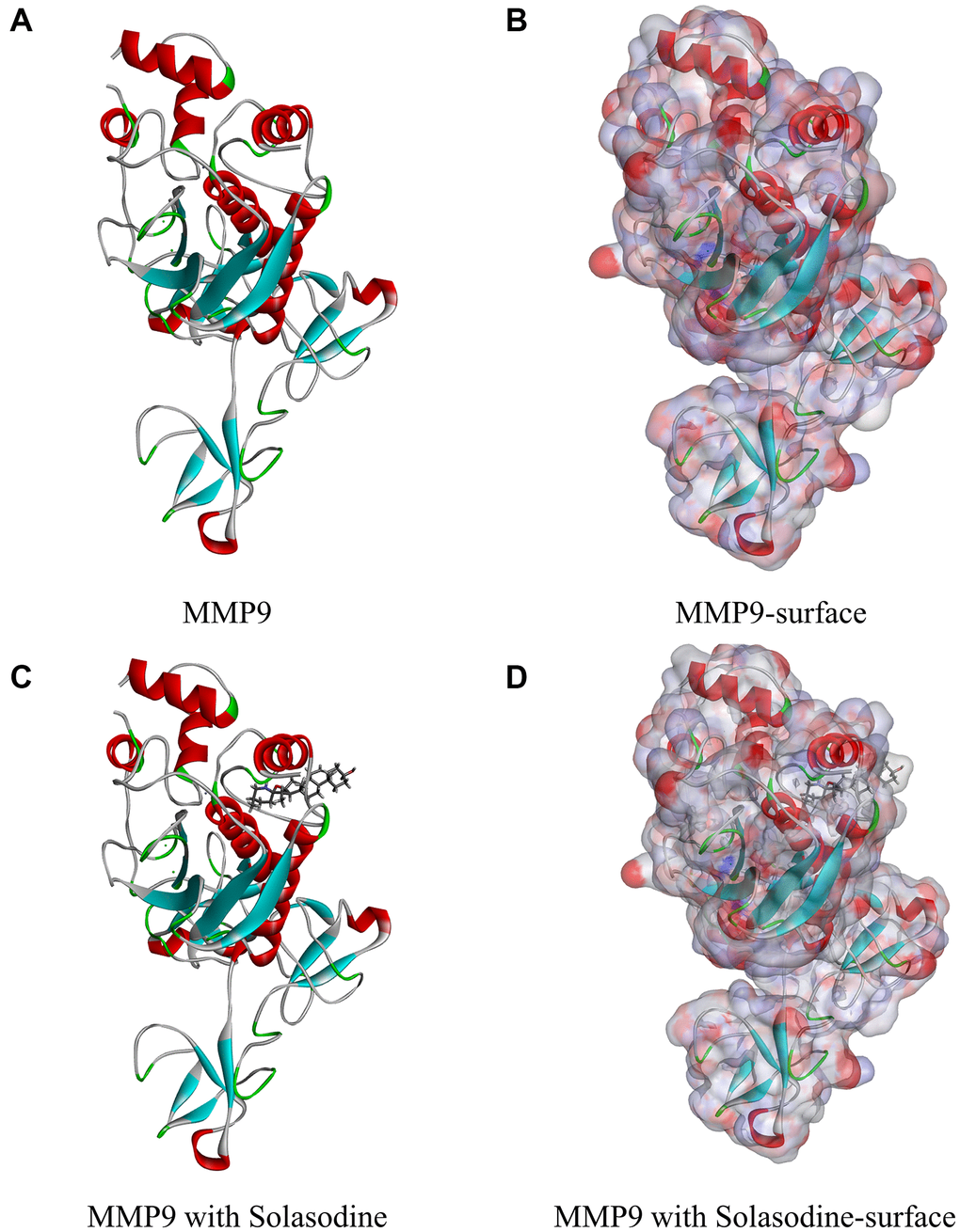 Molecular docking was conducted using the CDOCKER module, on the basis of CHARMM force field, which predicts the results of high-precision docking. Water molecule was removed and hydrogen atom was added onto MMP9 protein, in case the conformation of the receptor–ligand complex was affected by the fixed water molecules [33].