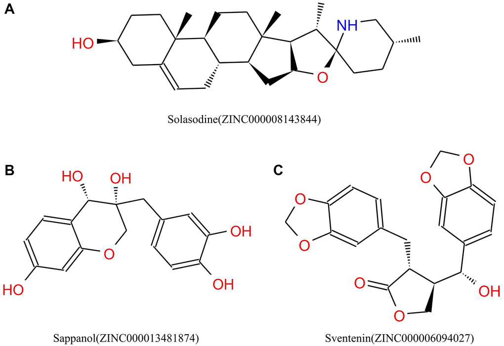 Safety must be considered during drug screening. The TOPKAT module of the Discovery Studio that can quickly calculate and predict the toxicity and environmental effects of these compounds, including Ames mutagenicity (Ames test), developmental toxicity potential (DTP), and rodent carcinogenicity, was used to analyze the safety of these 20 compounds and solasodine (Table 3). Of the 20 compounds, 15 compounds and solasodine were predicted to be non-mutagenic. Additionally, 11 ligands in female mouse, 9 compounds in male mouse, 6 compounds in female rat, and 12 compounds in male rat were noncarcinogenic. Solasodine was demonstrated to be a carcinogen in female mouse. Only five compounds were predicted to be nontoxic in DTP, whereas others and solasodine were demonstrated to be toxic. Thus, ZINC000013481874 and ZINC000006094027 were considered to be the two safe lead candidate compounds for further studies (Figure 2).