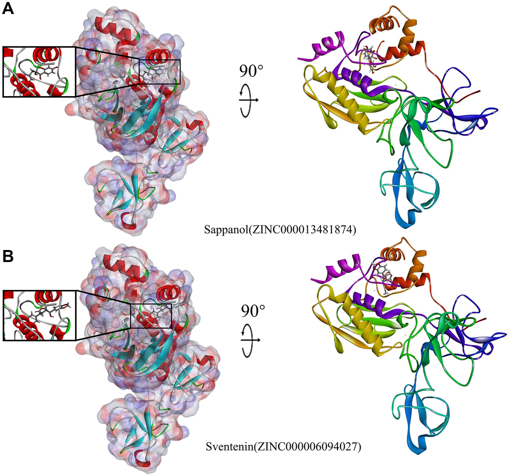 The CDOCKER module was employed to verify that sappanol and sventenin could bind with MMP9. Additionally, the CDOCKER potential energy of these two candidate ligands and solasodine was analyzed. The results suggested that sappanol and sventenin had lower potential energy than solasodine. We also compared the hydrogen bonds, π-related interactions, and pharmacophore of these two compounds and solasodine. The results indicated that sappanol and sventenin exhibited a higher binding force with MMP9 than solasodine.