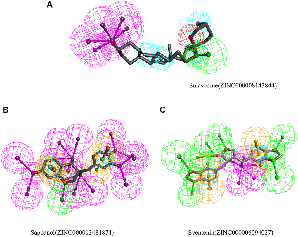 Feature mapping was used to generate pharmacophore models with predictive activity on the basis of a series of compounds with well-defined activity values for specific biological targets. It can analyze hydrophobic, hydrogen bond (HB) acceptor, HB-donor, ring aromatic, and positive ion, a total of five types of attribute elements. The pharmacophore of the two compounds and solasodine was compared.