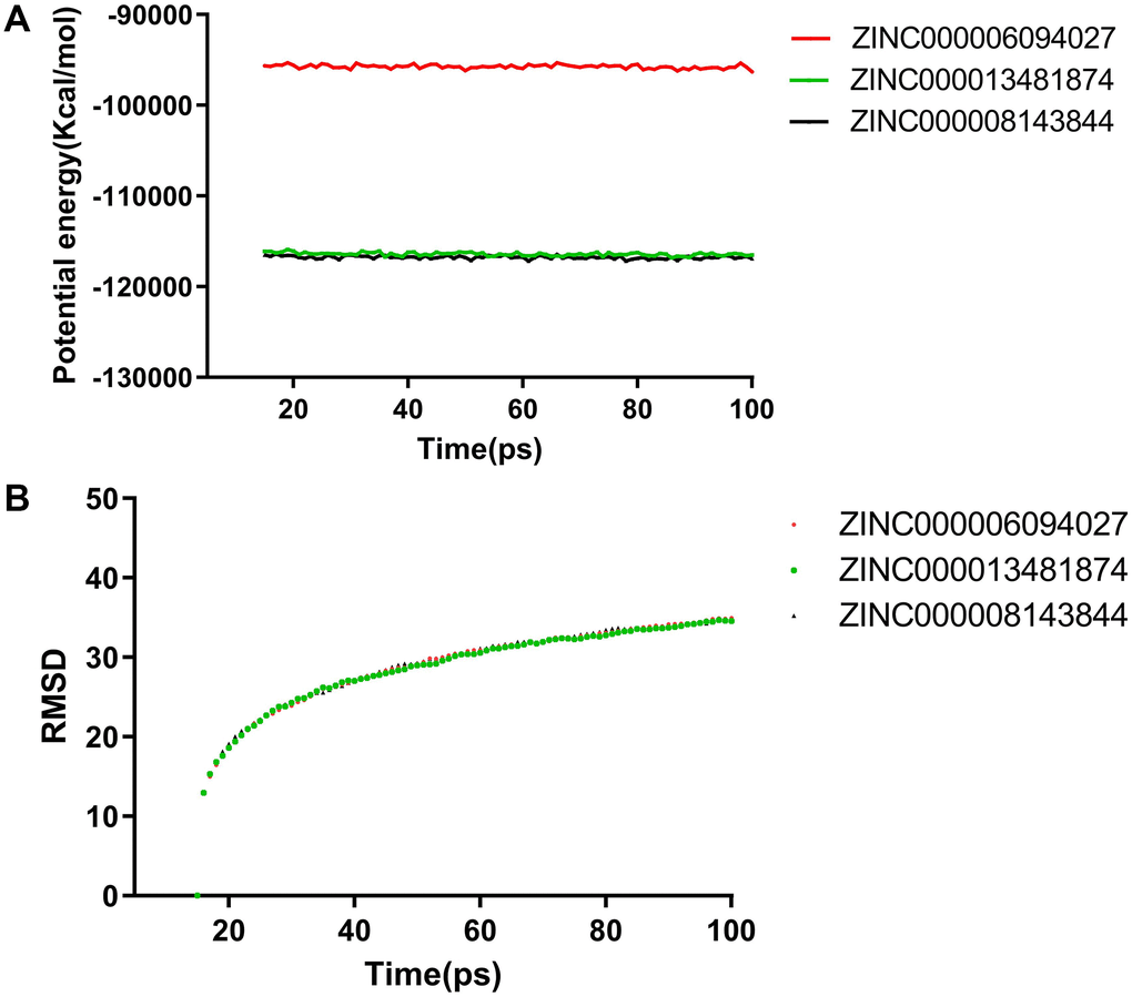 Molecular dynamics simulation was employed to verify the stability of the compound–MMP9 complexes by running the RMSD and calculating potential energy. Calculations exhibited that the trajectories of both sappanol and sventenin reached their equilibrium and stabilized with time, indicating that the three ligand–MMP9 complexes could become stable in a short time period under natural circumstances. Therefore, sappanol and sventenin could be regarded as the ideal natural ligands for MMP9 inhibitor drug development and may be used for the treatment of patients with CCRCC.