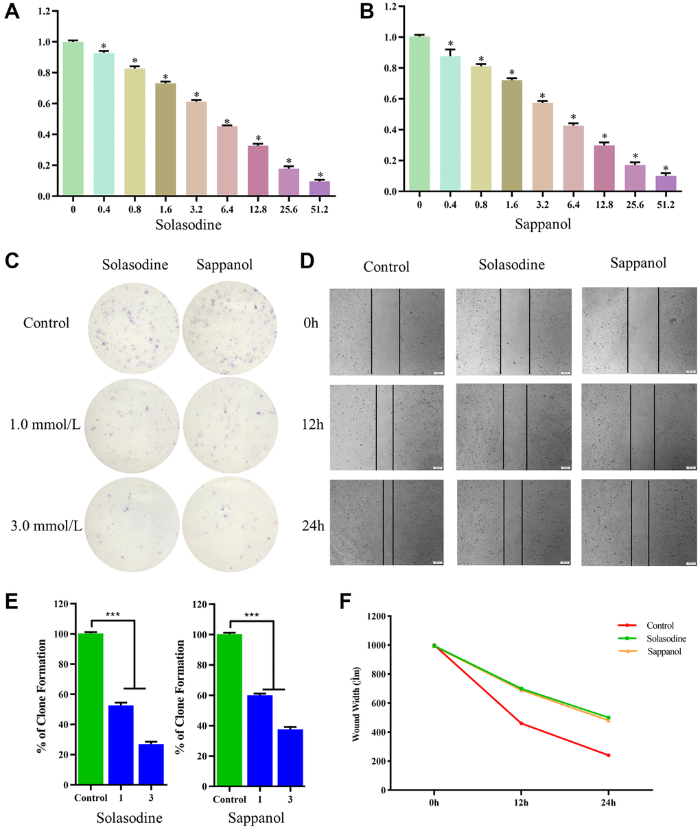 The in vitro scratch assay was conducted to evaluate 786-O cell migration. The widths of the cell-free areas were measured 12 and 24 h after the scratch. The widths of the scratched area in solasodine and sappanol groups were significantly smaller than those in controls (P < 0.05) (Figure 7D and 7F).