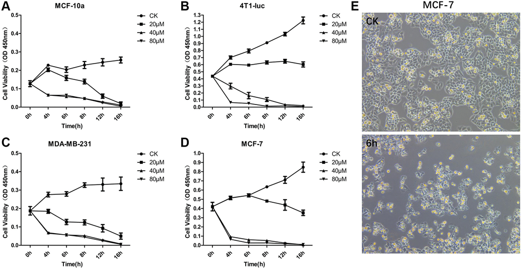 To study the effect of different concentrations of OA on the proliferation of breast tumor cells, we set three concentration levels: 20 μM, 40 μM and 80 μM. MCF-10a, 4T1-luc, MDA-MB-231 and MCF-7 cells were treated with the above concentrations for 16 hours (16 h), and the cell activity of each group was then detected by the CCK-8 method (Figure 1A–1D). The results showed that a low concentration of OA (20 μM) had no significant effect on the survival rate of MCF-7 and 4T1-luc cells. When the concentration of OA was 80 μM, the cell survival rate decreased significantly at both 4 h and 16 h after OA treatment, which indicated that a high concentration of OA (80 μM) had severe toxicity. After 40 μM OA treatment, the cell survival rate decreased significantly from 4 h to 16 h, which indicated a more effective drug effect. Compared with that of the control group, the cell survival rate began to decrease after 4 h of 40 μM OA treatment. When 40 μM OA treatment was carried out for 6 h, the cell survival rate decreased to a controllable range, which was the best time to collect samples for RNA sequencing (Figure 1E).