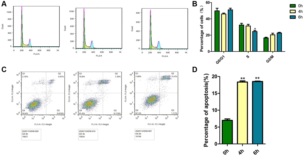 The decrease in cell viability might be caused by cell cycle arrest or apoptosis. The cell cycle and apoptosis in MCF-7 cells were analyzed by flow cytometry measurements after treatment with 40 μM OA for various hours (0 h, 4 h and 6 h). The cell cycle was divided into the phases of sub-G1(M1), G1/G0 (M2), S (M3) and G2/M (M4) phases by flow cytometry, but in tumor pathobiology, the ratio of S phase cells is usually used as an indicator to judge the proliferative state of tumors. As shown in Figure 2A, when OA was treated for 6 hours, the proportion of S phase was the lowest, which was 24.54%. The data also showed that OA reduced cell proliferation in a time-dependent manner. To further assess the modes of cell apoptosis or necrosis induced by these compounds, MCF-7 cells were treated with 40 μM OA for various hours (0 h, 4 h and 6 h) (Figure 2B). Then, the cells were stained with Annexin V−FITC/PI and analyzed by flow cytometry. There were three subgroups in the experiment. The Annexin V−FITC−/PI− population was considered living cells. The Annexin V−FITC+/PI− population was considered early apoptotic cells, while Annexin V−FITC+/PI+ populations were considered late apoptotic cells. As shown in Figure 2C, cells treated with OA for 4 h were mainly at the early phase of apoptosis, and 6 hours after OA treatment, cells were at the end phase of apoptosis. OA at 40 μM induced significant (*p < 0.05) cell apoptosis at 4 h and 6 h (Figure 2D). These data indicate that OA mainly induces MCF-7 cell apoptosis.