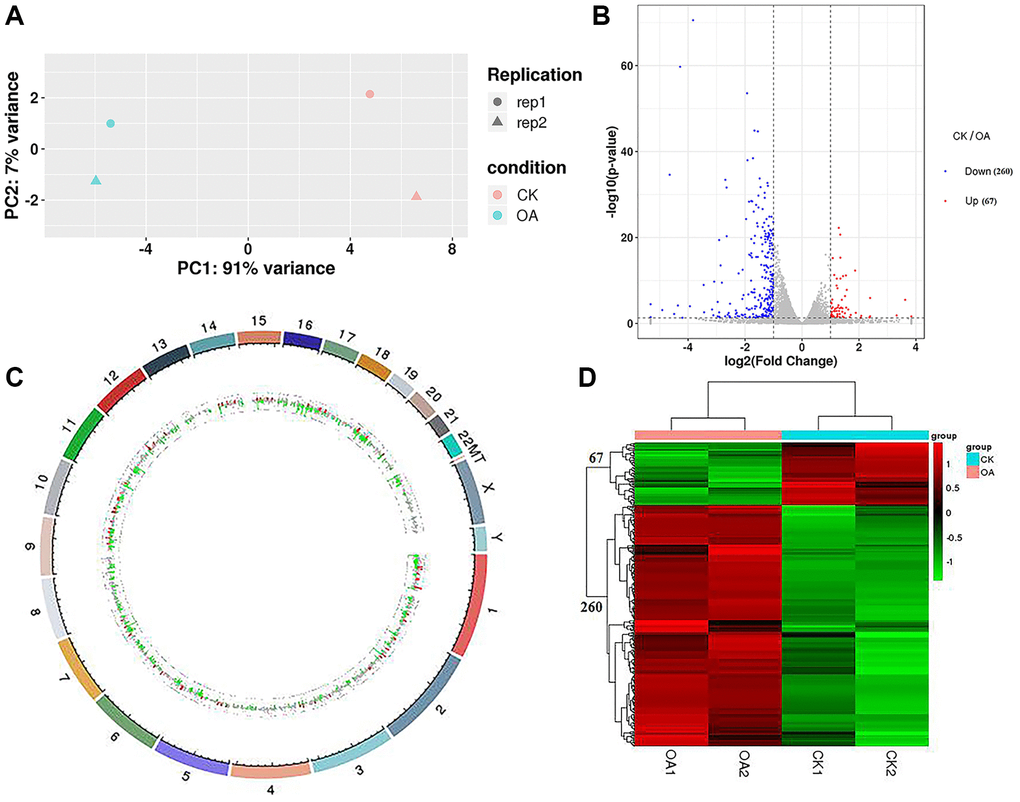 By comparing the gene expression profile data of the CK group and OA group (CK/OA), based on the threshold standard of |log2 fold change| > 1 and significance level p-value < 0.05, we screened 327 differentially expressed genes (DEGs) from 19970 transcriptome annotated genes, including 67 upregulated genes and 260 downregulated genes. The volcano plot of all DEGs is shown in Figure 3B. The details of these DEGs are shown in Supplementary Table 1. According to the genome location information, each DEG was labeled on the human genome (Figure 3C). DEGs were distributed on 23 chromosomes of the human genome, the most of which were the first chromosome, at approximately 42/327. There were also three differentially expressed genes identified on chromosome X: TSC22D3, REPS2 and CLCN5. According to the expression level of the same gene in different samples and the expression pattern of different genes in the same sample, the Euclidean method was used to calculate the distance, and combined with the longest distance method (complete linkage) to conduct two-way hierarchical clustering analysis on the selected differentially expressed genes and each group of samples. As a result, the four groups of samples were significantly distinguished by 67 upregulated gene sets and 260 downregulated gene sets by comparison of CK/OA. The heatmap of clusters is shown in Figure 3D.