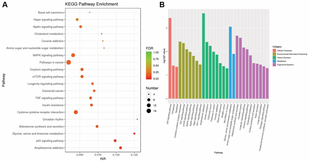 Based on the KEGG pathway database and the method of gene set enrichment analysis (GSEA), we identified 28 KEGG pathways with significant enrichment (p value less than 0.05) of differentially expressed genes and selected the top 20 pathways with the lowest p value, i.e., the most significant enrichment. The results are shown in Figure 4. Among these results, the cellular processes-related pathways include the p53 signaling pathway, ferroptosis and apoptosis. The related pathways of environmental information processing include the cytokine-cytokine receptor interaction pathway, TNF signaling pathway, mTOR signaling pathway, MAPK signaling pathway, Apelin signaling pathway, Hippo signaling pathway and HIF-1 signaling pathway. Human diseases-related pathways include amphetamine addiction, insulin resistance, colorectal cancer, pathways in cancer, cocaine addiction, basal cell carcinoma, bladder cancer and microRNAs in cancer. Metabolic pathways include glycine, serine and threonine metabolism, amino sugar and nucleotide sugar metabolism. The associated pathways of organic systems include aldosterone synthesis and secretion, circadian rhythm, longevity regulating pathway, oxytocin signaling pathway and cholesterol metabolism, cortisol synthesis and secretion, renin secretion, long-term potentiation, glucagon signaling pathway and parathyroid hormone synthesis, secretion and action.