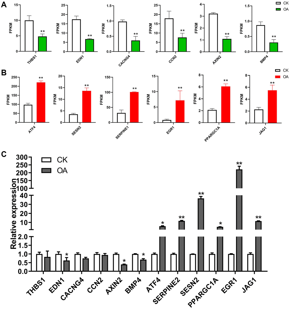 Four groups of samples were sequenced to obtain the raw data, and the data quality was evaluated. The results showed that the Q20 values of the four groups of sequencing samples were more than 95%, and the Q30 values were more than 92%, which met the requirements for subsequent data analysis. After data filtering and sequence alignment, we obtained the gene expression profiles of four groups of sequencing samples with a total of 19,970 transcripts. The results of principal component analysis (PCA) showed that the transcriptome data could distinguish the control group (CK1 and CK2) from the treatment group (OA1 and OA2) (Figure 3A).