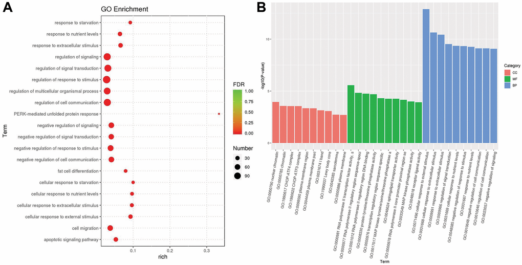We used the topGO tool to perform Gene Ontology (GO) enrichment analysis. In the analysis, we used the GO terms of the different genes to obtain the gene list and the number of genes enriched in each term, and then calculated the p value (p value < 0.05) by the hypergeometric distribution method to identify the GO terms in which the different genes were signaling enriched compared with the whole genome background in order to determine the main biological functions of different genes. Finally, we obtained 1489 GO terms of biological process (BP), 110 GO terms of cellular component (CC) and 225 GO terms of molecular function (MF). According to the GO enrichment results, we selected the top 20 GO terms with the lowest false discovery rate (FDR) value, that is, the most significant enrichment, for display with the degree of enrichment measured by rich factor and the number of genes enriched in each GO term. The bubble chart of the top 20 enriched GO terms is shown in Figure 6A. Furthermore, we selected the top 10 GO terms with the lowest p value, i.e., the most significant enrichment, from each GO category for display. The bar chart of the top 10 enriched GO terms is shown in Figure 6B. The most significant functional enrichment categories were GO:0000790 nuclear chromatin of CC, GO:0000981 RNA polymerase II transcription factor activity, sequence-specific DNA binding of MF, and GO:0071496 cellular response to external stimulus of BP.