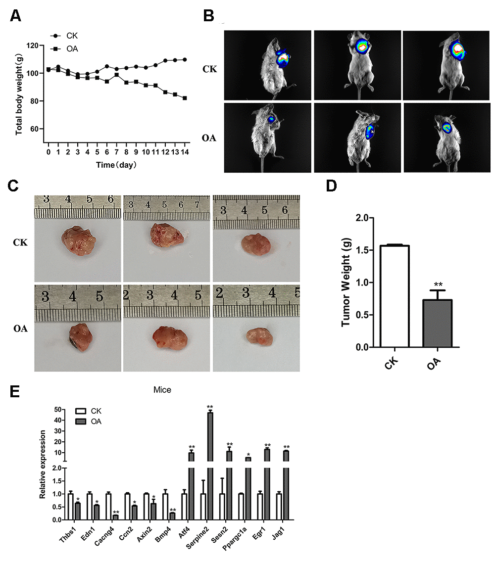 To further explore the anti-cancer effect of OA, we carried out in vivo experiments in mice. After transplantation of tumor cells, mice were administered OA for two weeks. In vivo bioluminescence imaging was used to explore the effect of OA on tumors in mice. As a result, compared with CK tumor model mice, the body weight of OA group mice decreased to some extent, while the size and weight of tumor decreased significantly. (Figure 7A–7D). It showed that OA might inhibit the breast tumor growth in mice, although OA treatment would also affect other physiological indexes of mice. According to the six upregulated genes and six downregulated genes identified by the above cell-level RNA-seq analysis, the function was verified by qPCR in vivo, the results of which were consistent (Figure 7E). The primers of target genes for qPCR were listed in Supplementary Table 2.