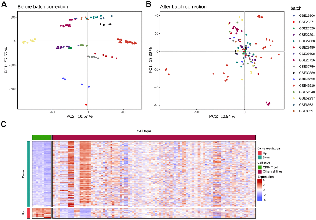 To compare immune cell response in KIRC and identify cell type-specific markers and related pathways in the tumor-infiltrating CD8+T (TIL-CD8T) cells, transcriptome data was collected from immune cells across multiple studies. The expression results of the immune cell chip data was downloaded from the GEO database (Table 1), and the data underwent an inter-study bias correction by the inSilicoMerging software package. The chip data distribution before and after batch effect calibration, were displayed in (Figure 1A, 1B), respectively.