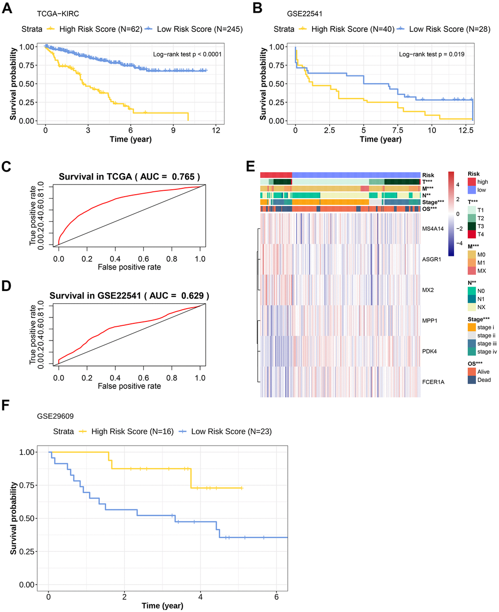 Based on our highly integrated multi-platform analyses across multiple datasets, the risk scoring model specific to TIL-CD8T was constructed. LASSO Cox regression, widely used in cancer research for predicting model construction, was adopted in our study [38–40]. Based on LASSO and TCGA-KIRC, the 6-gene risk scoring model corresponded to TIL-CD8T was constructed (Figure 2 and Supplementary Figure 2), which was further verified by GEO data cohorts (Figure 3). Those 6 genes in the model (PDK4, MPP1, ASGR1, MS4A14, FCER1A and MX2), rarely reported in cancers [41–44], were found to be significantly related to the prognostic survival of KIRC patients (Figure 2). In the model effectiveness evaluation, similar survival-related trend could also be found (Figure 3A, 3B, 3F). However, the survival trend in GSE29609 was contrary to those of TCGA-KIRC and GSE22541 (Figure 3A, 3B, 3F). In order to further explore the reasons for the failure of the model prediction in GSE29609, the primary data set was carefully checked. It was found that the limited number of patients and the high degree of heterogeneity among individuals might be the main disadvantages that led to the failure of the model prediction (Figure 3F). The ROC curve showed that the risk scoring model had a good predictive effect in TCGA-KIRC and GSE22541 (Figure 3C, 3D). Overall, it could be concluded that a higher risk score in our model corresponded to a higher mortality rate, which also indicated that our risk scoring model had a better predictive efficiency for the survival prognosis of KIRC patients (Figure 3E).