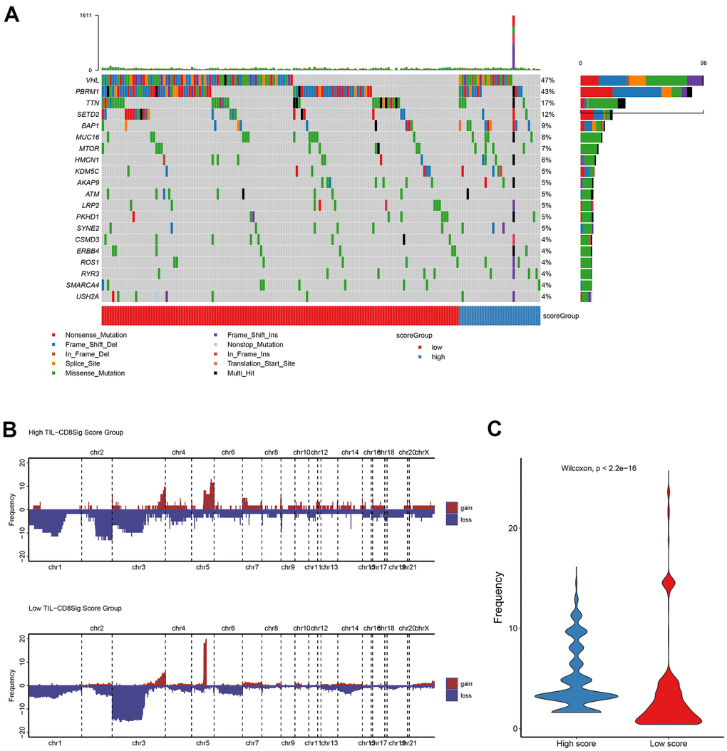 In order to clarify the correlation between TIL-CD8 Sig score and gene mutations, the R software package maftools was used to deal with the publicly available mutation annotation format (maf) files (Figure 4A), and evaluate the relationship between different TIL-CD8Sig scores and CNV (Figure 4B). It was found that the gene mutations and CNV status of patients in different TIL-CD8Sig score groups were different, and the CNV frequency was significantly different from each other (Figure 4C).