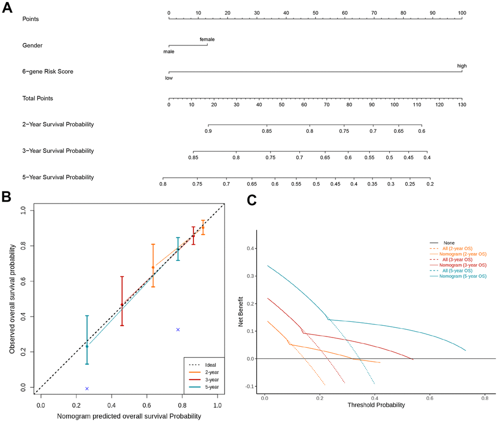 Nomograms had been previously shown as a reliable alternative tool that could help clinicians make individual predictions for survival. By integrating the TIL-CD8Sig score groups and clinicopathological risk factors, a nomogram for predicting the overall survival rate of TCGA-KIRC was constructed (Figure 5A). Through the standard curve diagram, it was found that the performance of the nomogram was equivalent to that of the ideal model (Figure 5B). Decision curve analysis (DCA) was used to quantify the clinical utility of it. For the overall survival probabilities of 2, 3, and 5 years, the decision curve showed that the nomogram could provide a better net benefit than the alternatives (Figure 5C).