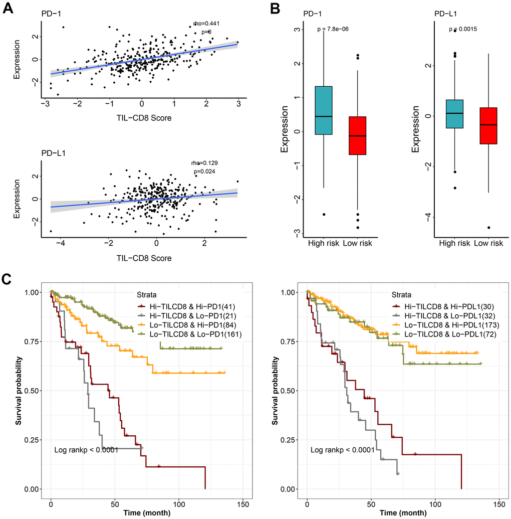 Immune checkpoint molecules, such as PD-1 and PD-L1, had been identified as crucial regulators of the immune response. However, the prognostic significance of these immune checkpoint molecules was still controversial. We wanted to further investigate the relationship between TIL-CD8 Sig score and the PD-1/PD-L1 expression levels. As shown in (Figure 6A), the TIL-CD8 Sig score was significantly correlated with both PD-1 and PD-L1 (PD-1: spearman correlation coefficient rho= 0.441, P <0.001; PD-L1: spearman correlation coefficient rho=0.129, P=0.024). To further evaluate the expression patterns of immune checkpoint genes in different TIL-CD8Sig score groups, it was found that the PD-1 (Wilcoxon rank sum test P<0.001) and PD-L1 (Wilcoxon rank sum test P<0.01) expression levels in the high-risk group were significantly higher than those of the low-risk group (Figure 6B).