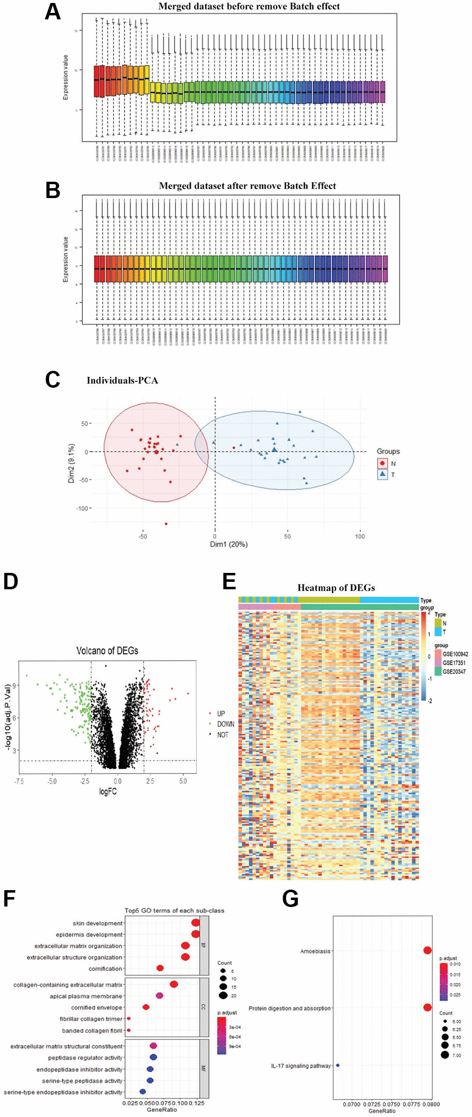 GO analysis showed that DEGs were mainly involved in skin development, collagen-containing extracellular matrix, and extracellular matrix structural constituent (Figure 1F). The enriched pathways obtained in KEGG analysis were amoebiasis, protein digestion and absorption, and IL-17 signaling pathway (Figure 1G).