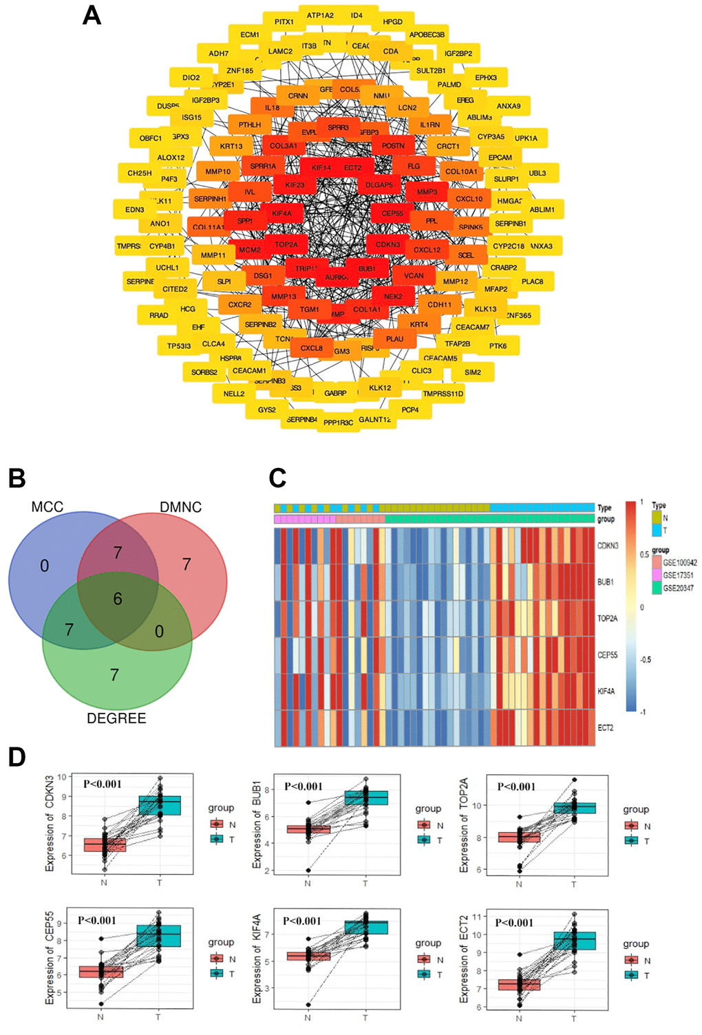 As displayed in Figure 2A, the most significant module and PPI network of DEGs was obtained by STRING and Cytoscape. Hub gene screening was accomplished using cytoHubba module. We then applied the three most common topological algorithms (Maximal Clique Centrality, Density of Maximum Neighborhood Component and Degree) to filter the top 20 genes, and finally, we obtained six hub genes. Figure 2B and Figure 2C displayed the Venn diagram and heatmap of six hub genes, respectively. The expression difference between paired samples of tumor and normal group of the six genes from GEO database is demonstrated in Figure 2D. The six hub genes, namely CDKN3, BUB1, TOP2A, CEP55, KIF4A, and ECT2, were all upregulated in ESCC. The names, abbreviations, and functions for these hub genes were shown in Table 1.