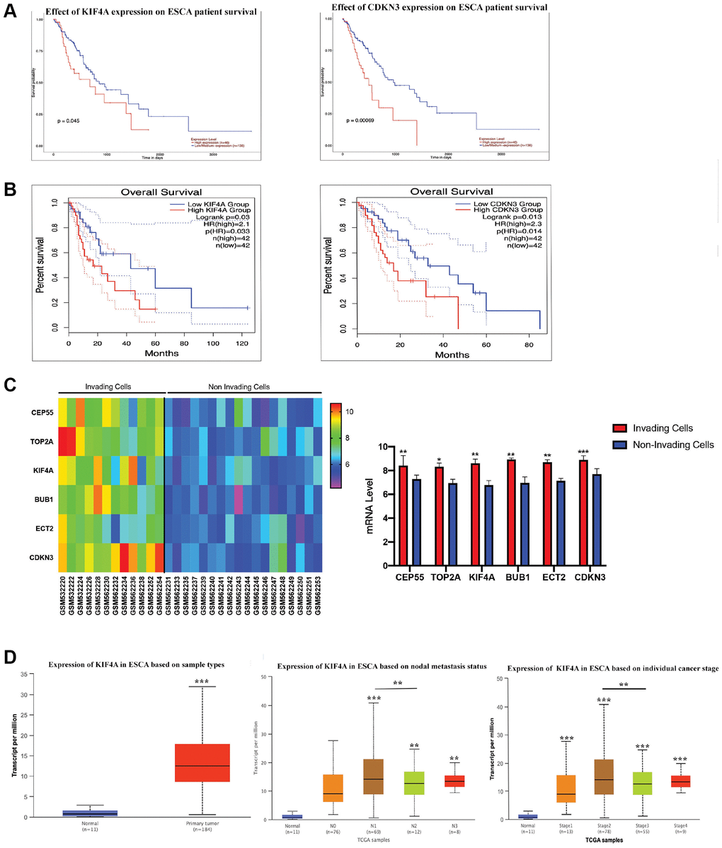 To determine whether hub genes were linked to ESCC patients’ survival, six prognostic hub genes were identified and survival analysis was further performed. Only high KIF4A and CDKN3 expression were correlated with poor OS in ESCC patients (Figure 3A–3B, and Supplementary Figure 2). However, CDKN3 demonstrated that it might promote proliferation, migration and invasion of ESCC via the AKT pathway [44]. In order to study whether these six hub genes affected ESCC metastasis and invasion, the expression levels of these genes were analyzed through the GSE21293 dataset which containing invading and non-invading EC cells [17]. Primary esophageal cells were established from surgically resected specimens of ESCC patients (n = 35). The present study showed that the expression levels of all six hub genes were up-regulated in invading cells (Figure 3C). In conclusion, we determined that KIF4A was our research target. Meanwhile, for N categories, high KIF4A expression was tightly correlated in patients with N1, N2, and N3 stages. Moreover, KIF4A expression was closely associated with stage I, II, III, and IV (Figure 3D). All in all, among these six hub genes, KIF4A may be a prognostic indicator of ESCC.