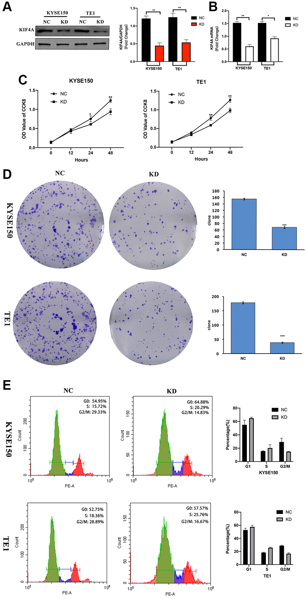 In order to study the potential role of KIF4A play in the progress of ESCC, we used lentiviral KIF4A short hairpin RNAs (shRNAs) stable knockdown the expression of KIF4A in KYSE150 and TE1 cells, and a scrambled shRNA was used as a negative control (NC). The expression of KIF4A in cells was evaluated by WB (Figure 5A) and qRT-PCR (Figure 5B). Based on these results, CCK-8 cell assay showed that the proliferation capability of the two cell lines was significantly reduced after KIF4A knockdown (Figure 5C). Colony formation experiment confirmed that KIF4A knockdown cells produce lower numbers and smaller colonies (Figure 5D). In addition, we have further investigated whether exhaustion of KIF4A can lead to cell cycle stoppage. The results showed that KIF4A knockdown can trigger the G2/M phase arrest of KYSE150 and TE1 cells, resulting in a significant increase in the ratio of G2/M phase cells (Figure 5E). In summary, these data suggested that KIF4A might be essential for proper mitotic progression. However, KIF4A had no significant effect on apoptosis in both ESCC cell lines (Supplementary Figure 3). These results suggest that KIF4A promote ESCC cell proliferation.