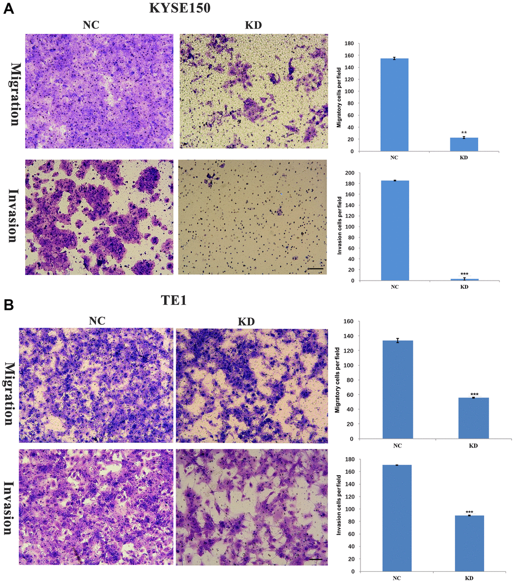 An earlier study found that KIF4A expression was significantly associated with metastasis and prognosis in HCC patients [26]. Our data revealed that the expression of KIF4A was associated with distant metastasis in ESCC patients. By studying the cell movement of ESCC after KIF4A knockdown, the effect of KIF4A on the migration and invasion of ESCC cells was explored. The results showed that invading and migrating ESCC cells were significantly inhibited (Figure 6A–6B). These results indicated that KIF4A promoted migration and invasion of ESCC cells.