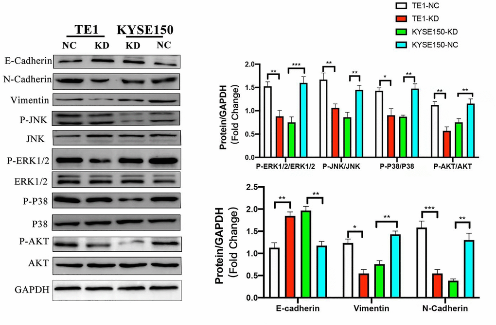 We used WB to test the expression levels of phosphorylated AKT and P38, ERK1/2 and JNK after knockdown of exogenous KIF4A in ESCC cells, with the purpose of studying the effect of KIF4A on PI3K/AKT and MAPK pathways, and the results showed that all the markers above decreased in KIF4A knockdown cells. EMT plays a crucial role in migration and invasion of tumor cells derived from epithelial cells. We detected EMT hallmark using WB, and we discovered increased expression of E-cadherin (E-cad) and decreased expression of vimentin and N-cadherin (N-cad) after exogenous KIF4A knockdown in ESCC cells. The results were all shown in Figure 7. Overall, our findings showed that KIF4A promoted tumorigenesis and metastasis through the promotion of the PI3K/AKT and MAPK pathway and EMT in ESCC, respectively.