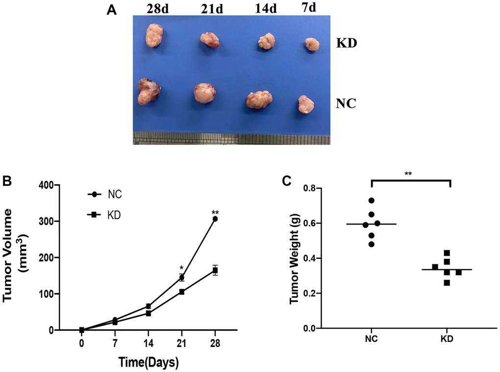 BALB/c nude mice (aged 6–8 weeks) were purchased from Beijing Vital River Laboratory Animal Technology Corporation. Mice experiments were approved by Tongji Hospital Affiliated to Tongji University, Animal Care Committee of Tongji Hospital Affiliated to Tongji University. Stable KIF4A knockdown cells and control Kyse150 cells (5 × 106) were injected into the mice’s armpits. The volume (V) of formed tumor was computed using the formula V = L × W2/2 (L: long axis; M: short axis). Twenty-one days after the injection, the nude mice were sacrificed, and the tumors were dissected and weighed.