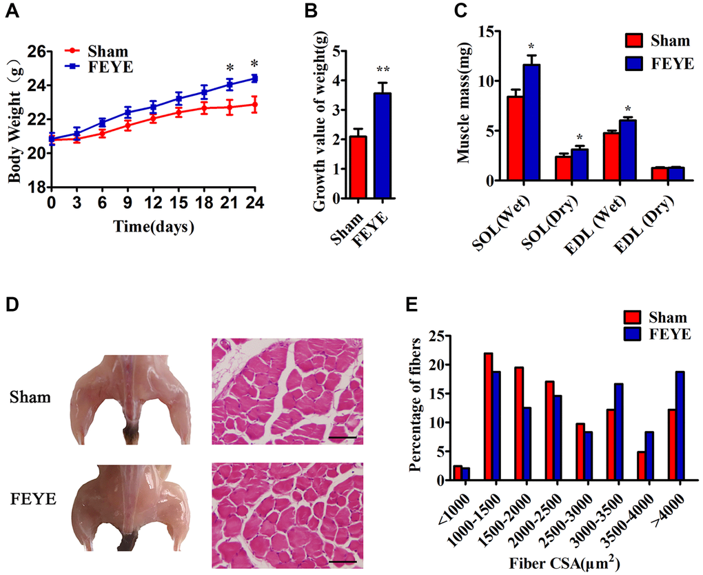 In order to prove the effect of FEYE on the body weight of mice, mice were fed with FEYE by gavage for 24 d. During this period, the mice were given the same forage and housed under the same living environment. The body weight of mice in the FEYE group was significantly higher than that in the sham group (Figure 1A). And compared with sham group, FEYE could obviously increase the growth value of body weight (Figure 1B). In addition, we measured the dry and wet weights of soleus muscle (SOL) and extensor digitorum longus (EDL) by isolating mice muscle. The results showed that the wet weight, dry weight of SOL and the wet weight of EDL in the FEYE group increased significantly (Figure 1C). Compared with the sham group, the area of muscle fiber also increased significantly (Figure 1D, 1E). These results demonstrate that FEYE can increase the weight of skeletal muscle via enlarging muscle fiber area in the mice.