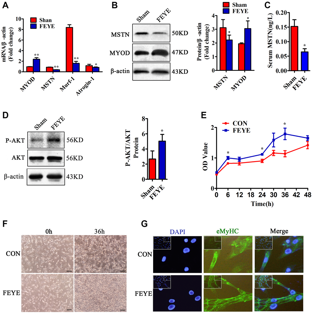 Previous study has been proved that MSTN plays a role in negatively regulating muscle development [2]. To prove the influence of FEYE on the expression of muscle-related genes, we detected the expression of MYOD, MSTN, Murf-1 and Atrogin-1 in skeletal muscle tissues. First, the results found that FEYE obviously down-regulated the mRNA levels of Murf-1 and Atrogin-1 in skeletal muscle tissues (Figure 2A). The levels of MSTN mRNA and protein were also suppressed in the FEYE-treated group (Figure 2A, 2B). Meanwhile, the levels of MYOD mRNA and protein in the FEYE-treated group were up-regulated (Figure 2A, 2B). To verify the effect of FEYE on MSTN secretion in the mice serum, the ELISA assay measured the secretion level of MSTN and found that FEYE significantly hindered the secretion of MSTN in the serum (Figure 2C). FEYE not only inhibited the expression of MSTN and other factors, but also activated the PI3K/AKT pathway (Figure 2D). Therefore, FEYE can accelerate the development of skeletal muscle and activate the PI3K/AKT signaling pathway.