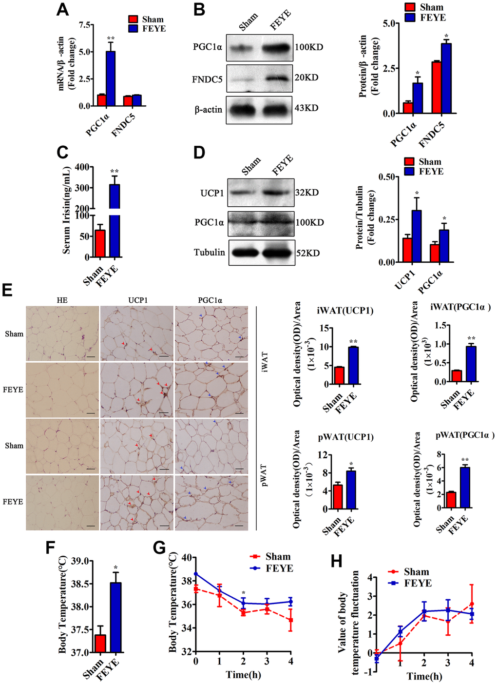 To confirm the effect of FEYE on heat production, we measured the rectal temperature when the mice were treated at room temperature and 4°C. The basal body temperature of mice in the FEYE group was significantly higher than that in the sham group (Figure 3F). When the mice stimulated with 4°C for 4 h, the FEYE-stimulated mice always maintained a high body temperature. Importantly, although the body temperature of mice in the two groups showed a sharp downward trend from 0 to 2 h, the body temperature showed a significant difference between sham group and FEYE group at 2 h of cold treatment. Otherwise, during the period of 2 to 4 h, the body temperature of the sham group still showed a downward trend, while the body temperature of the FEYE group mice was relatively stable (Figure 3G). The results showed that the temperature fluctuation of mice in the FEYE group was smaller than that in the sham group, and it demonstrated FEYE could enhance the tolerance to cold environment (Figure 3H). Hence, our research results jointly emphasize that FEYE can promote the secretion of Irisin in mice skeletal muscle and mediate WAT browning.